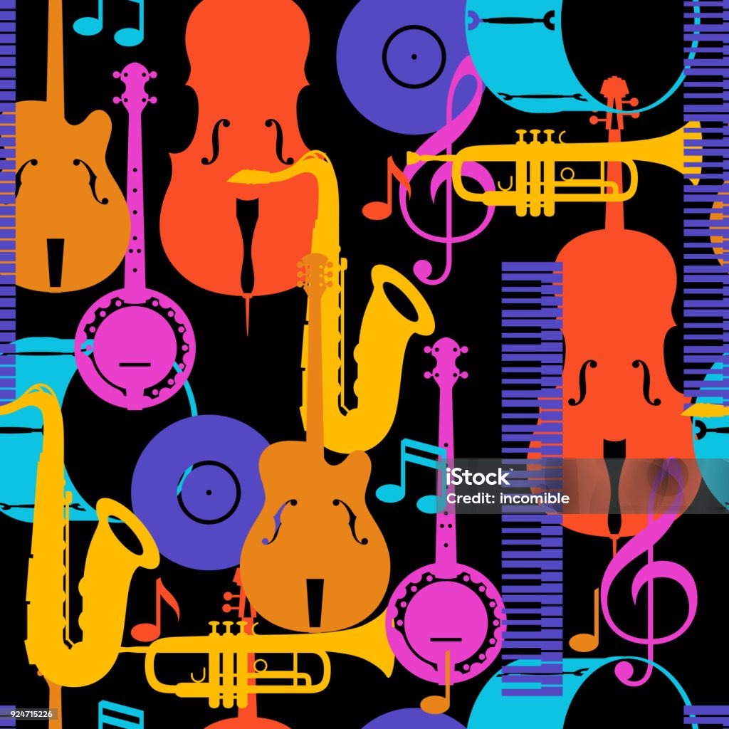 Jazz music seamless pattern with musical instruments.